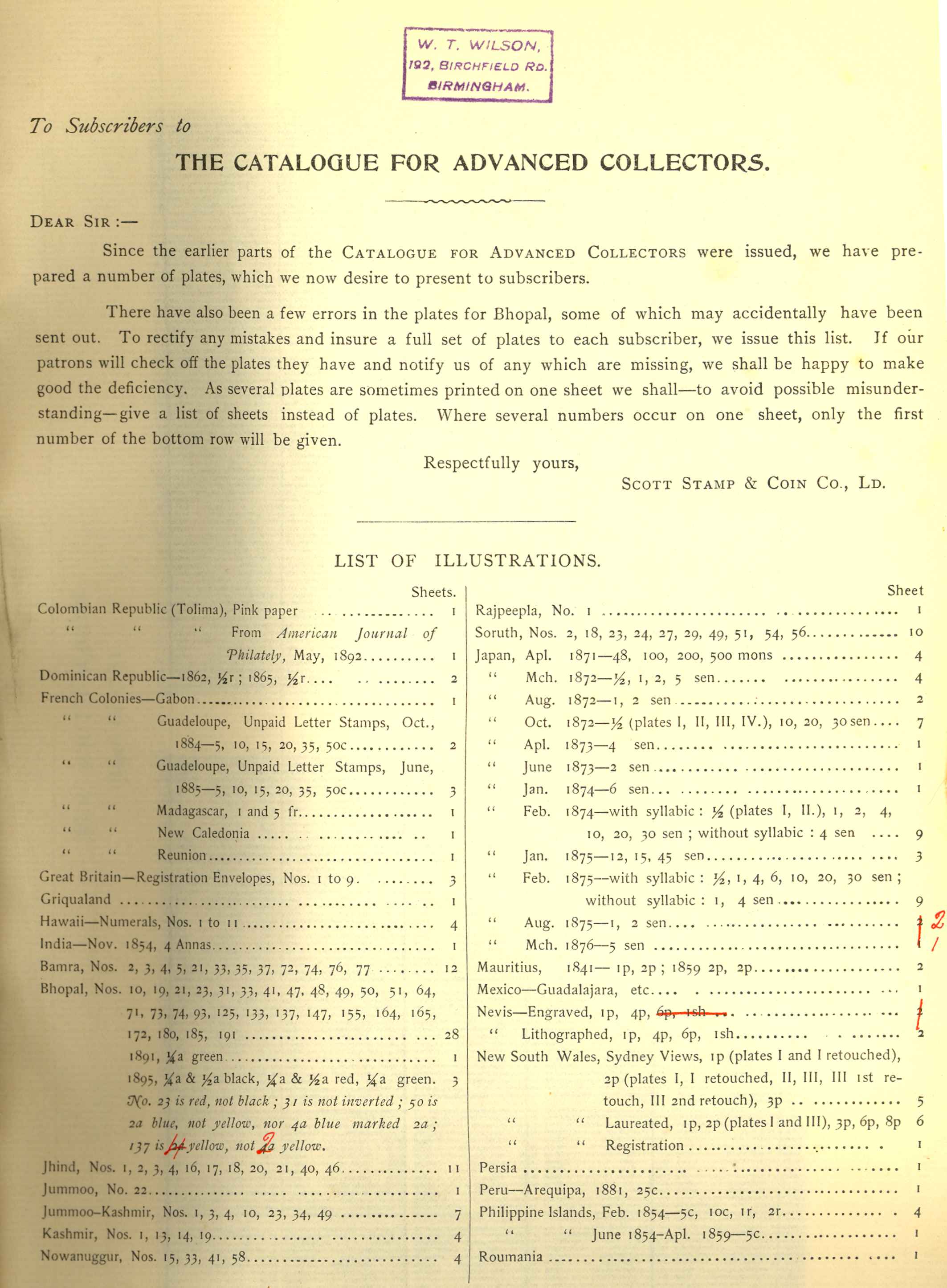- Letter bound in "To Subscribers to The Catalogue For Advanced collectors................. Scott Stamp & Coin Co., Ld"